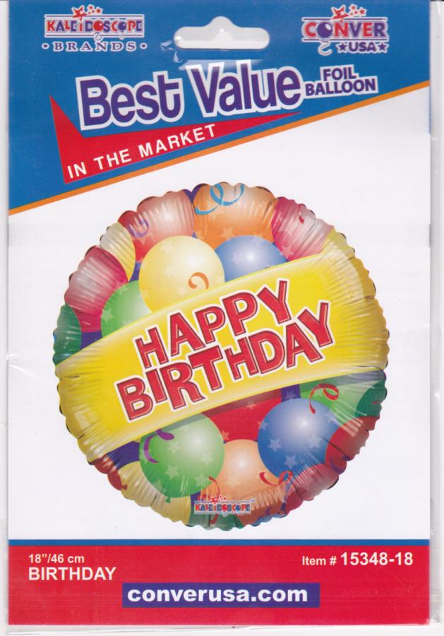 Birthday Mylar balloons. Each one is individually packaged for display with a picture of the design on the front of the package. Balloons are 18" size and are self sealing